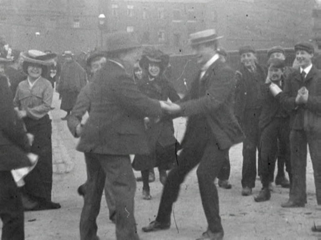This film marks Mitchell & Kenyon's second visit to the ornate factory gates of Haslam's. While the earlier film captures mill-workers with young children traipsing through January snow, the sunny weather this time sees all classes and types of people - the well-dressed and shawl-clad alike - out and about, skipping and dancing, theatrically knocking off hats and performing for the camera.