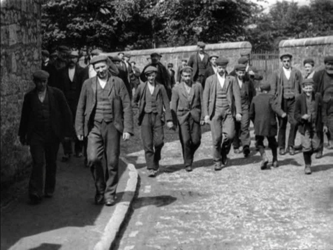 Seen beside some of Mitchell and Kenyon's more typical 'factory gate' films - energetic, crowded and urban - this spacious, small-town example, shot outside a much more compact workshop, is a real breath of fresh air. As workers amble down the semi-rural street, the cameraman, perhaps impatiently, stops and starts the camera. Lots of cheeky wee boys liven things up with their sociable scrapping.