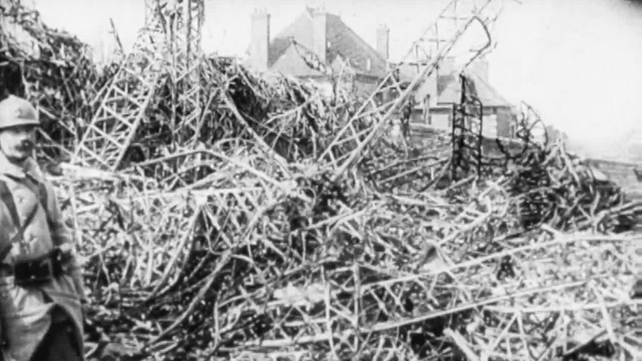 On the night of 16 March 1917, five German Zeppelins attempted their first high altitude bombing raid over London, hoping to attack from 17,000 feet. Cloud cover and heavy winds made for an unsuccessful raid - blown over the Channel and into France, the L.39 was shot down by French artillery. This Topical Budget newsreel sensationally declares that audiences are seeing the burning ruins just after the airship came down, yet there's no tell-tale fire and no smoke - just a damaged engine among masses of twisted metal, hardly recognisable as a machine of war. It's likely the wreck had in fact been there for some time before the cameraman arrived.