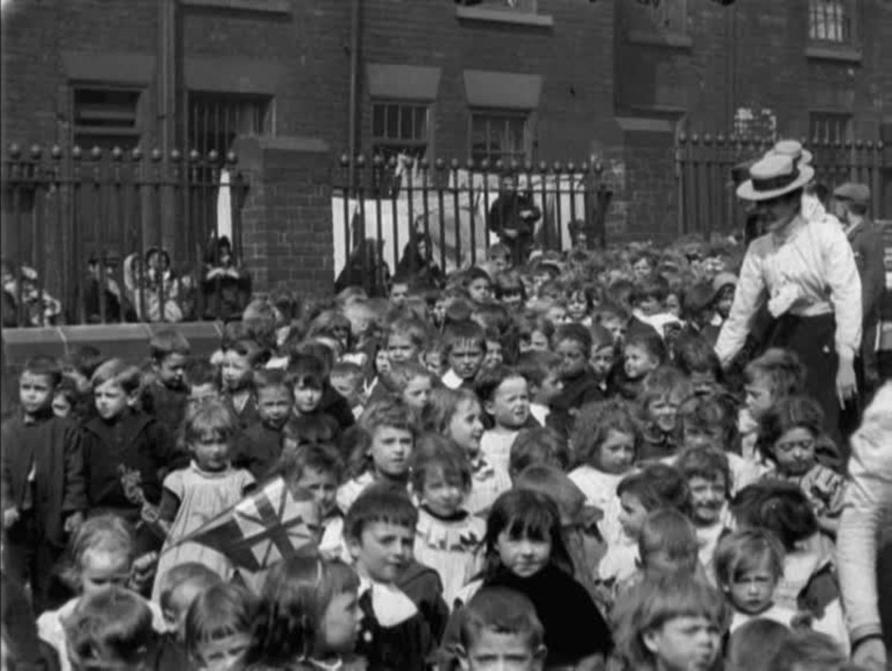 Watch out for the gawping lad on the extreme right of the frame. Notably older than the other children, he may have been employed for the day by Mitchell and Kenyon's cameraman to stand as a marker, helping the teachers to steer their classes to the benefit of the camera.