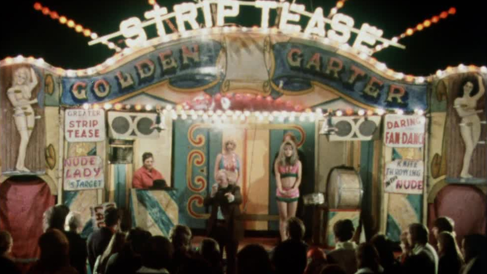 "If you're narrow minded or killjoys then for goodness' sake stay outside," warns Wally Shufflebottom Snr. as he warms up a chilly 1970s crowd for "the great striptease knife throwing". Inside the tent, it’s "cold steel against warm flesh" for Fearless Pauline - "the girl with the nerve of steel". Music plays, girls gyrate on podiums and Wally and his wife reveal all about their amazing sideshow.
