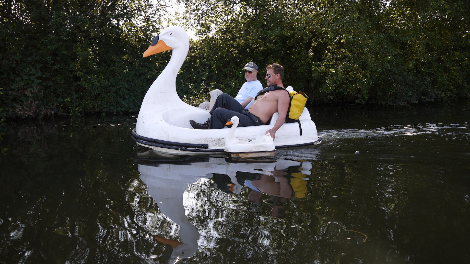 In Autumn 2011 Andrew Kötting (Gallivant) filmed an eccentric journey by swan-shaped paddle boat, in the company of writer and London obsessive Iain Sinclair. Navigating the rivers and canals linking Hastings to London's Olympic park, the two reflect on London, England and the ways their trip may change them. Along the way they meet comedian Stewart Lee, writer Alan Moore and actor Dudley Sutton.
