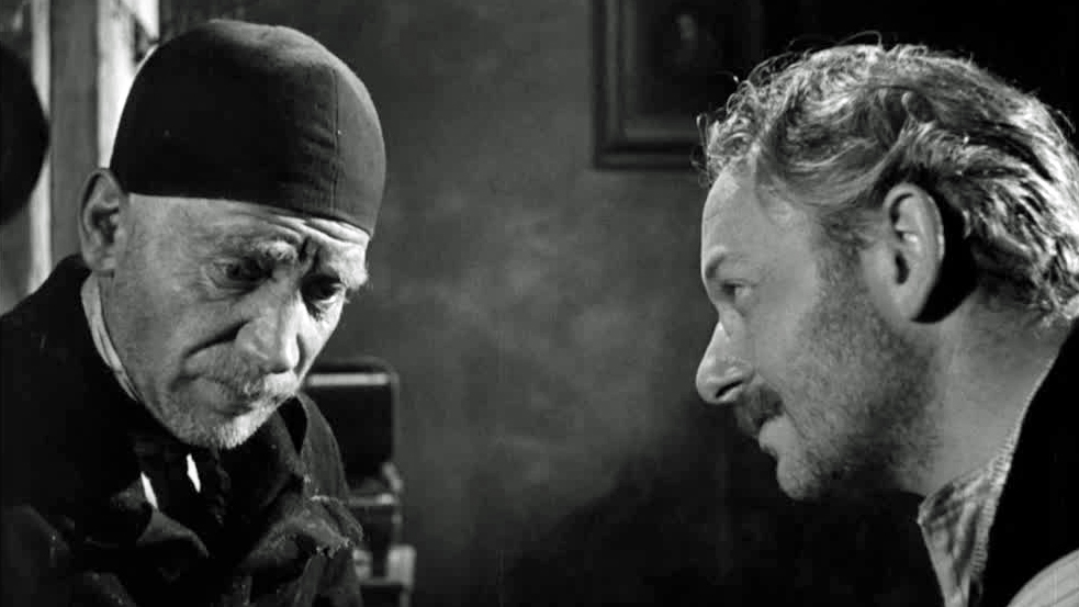 The Bespoke Overcoat is almost a two-hander between the tailor Morry (David Kossoff) and the clothing accountant Fender (Alfie Bass), the actors reprising their roles from Wolf Mankowitz' stage adaptation (which relocated the action to London's Jewish East End). Fender, suffering bitterly from the cold, is unable to afford one of the luxury sheepskin overcoats sold by his boss, so he asks Morry to repair his old one.