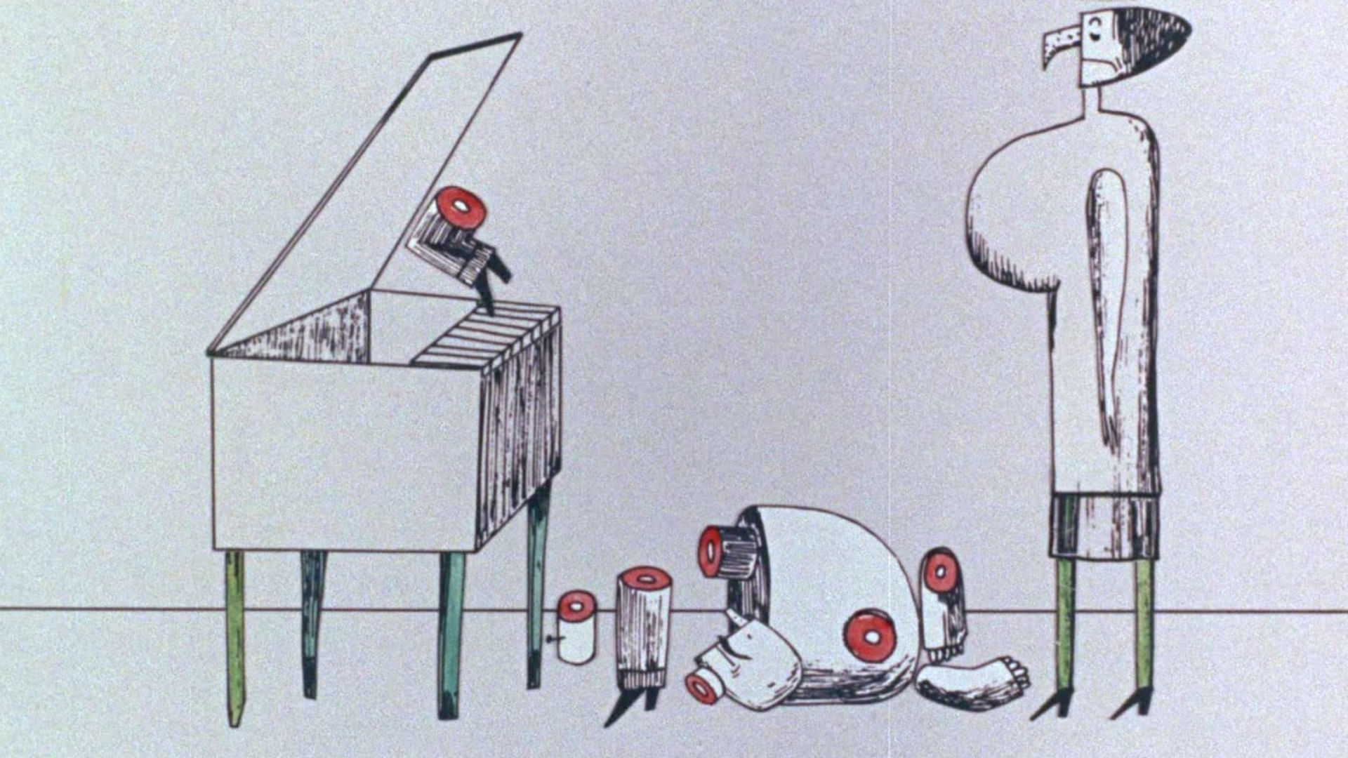 Walerian Borowczyk's (The Beast, Immoral Tales) first feature-length work is an existential soap opera that eschews dialogue (for the most part) and conventional narrative to evoke the highs and lows of married life. Set in a barren wasteland thinly populated by exotic flora and fauna, it follows the struggles of diminutive Mr Kabal against his domineering, monstrous wife, rendered in sparse, coarse and mainly monochrome graphics.